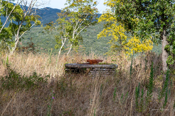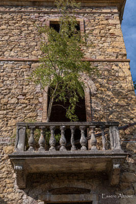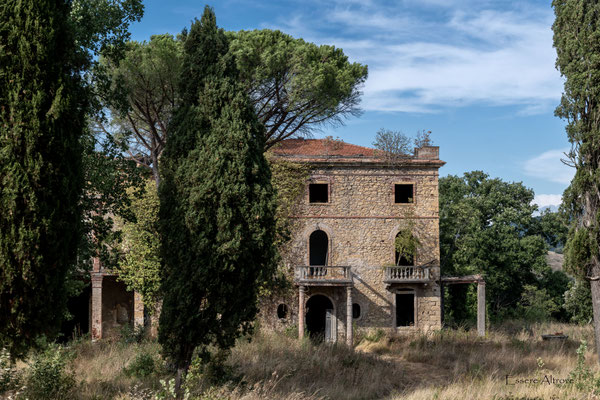 Dopo aver scollinato su assolate strade di campagna in mezzo al nulla assoluto, finalmente giungiamo ad una piana con un lunghissimo rettilineo, al centro del quale si apre uno sterrato percorribile fino ad un certo punto. Di lì in poi è necessario proseguire a piedi, lungo uno sconnesso tratturo in salita, fino a raggiungere una collina. Il segnale che si è sulla strada giusta sono due alberi, un pino ed un cipresso, affiancati e solitari in mezzo ad un campo brullo. In cima alla collina, semi nascosto da un boschetto incolto, l’oggetto della nostra ricerca: Villa Santa Ottavia. Siamo nella Valdicecina, ai margini della fittissima foresta di Berignone, in una zona assai isolata.